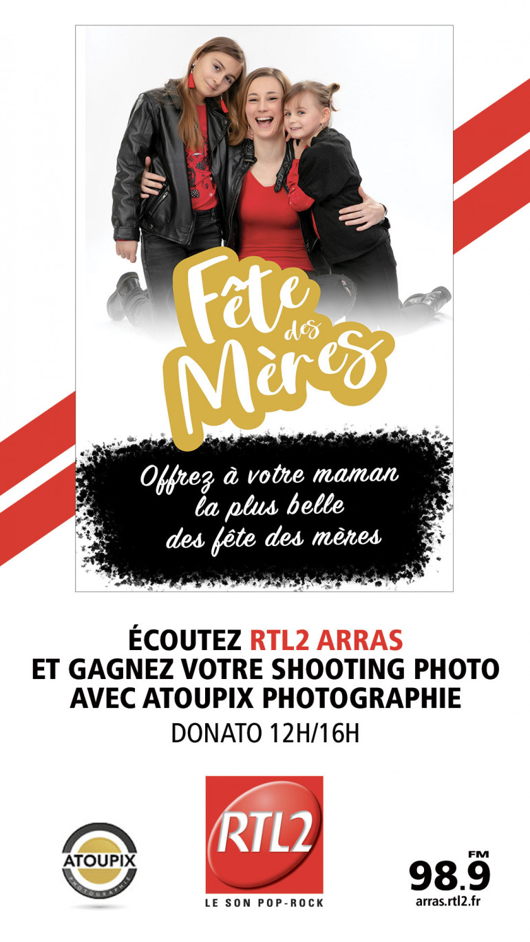 Jouez avec Donato Guaetta entre midi et 16h, dès que vous entendez le signal RTL2, appelez le 03 59 85 32 01 et gagnez votre séance de shooting photos avec coiffure, maquillage et photos numériques chez Atoupix Photographie.