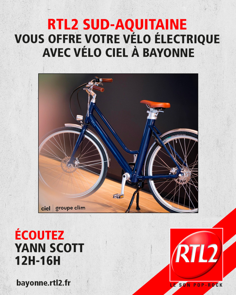 Cette semaine, écoutez RTL2 Sud-Aquitaine entre midi et 16h, dès que vous entendez le signal RTL2, appelez le 05 47 51 30 51 et tentez de gagner votre vélo à assistance électrique avec Vélo Ciel à Bayonne