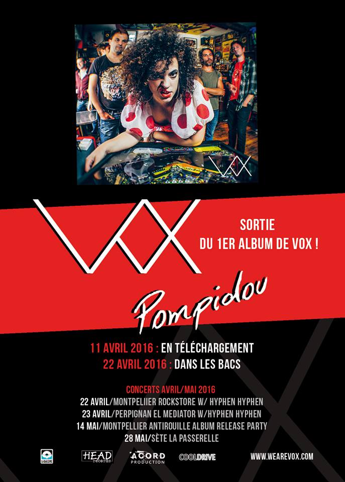 Le groupe montpelliérain de musique pop rock VOX, né en 2012 est en cours de réalisation de son 1er album qui fera suite aux 2 premiers Ep. Ces premières expériences ont été remarquées : chronique élogieuse dans Rock N Folk, programmation en 1ere partie de Johnny Hallyday, de Jacques Higelin, the BellRays, collaborations avec Félix et Krishoo du groupe FFF (vainqueur de Victoires de la Musique « Meilleur live », avec Emmanuel Djob…).