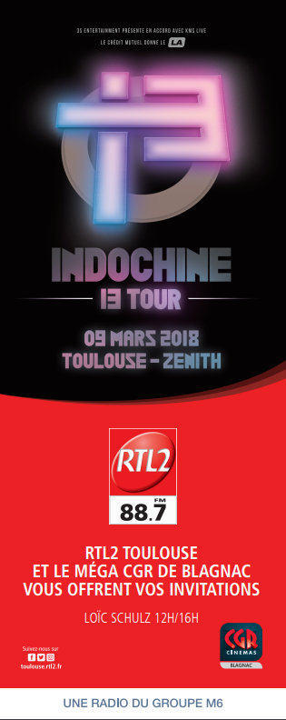 tentez votre chance en remplissant le bulletin jeu. A remporter vos invitations pour le concert RTL2 d' Indochine le 9 Mars au Zénith de Toulouse.