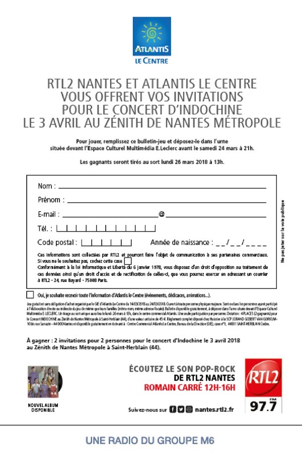 Indochine jeu concours RTL2 et Atlantis le Centre