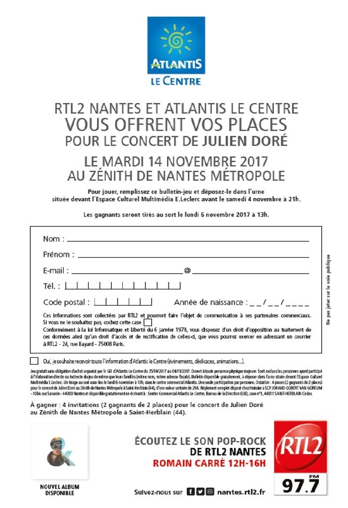 Pendant quelques jours en allant vous balader à Atlantis Le Centre, vous allez pouvoir tenter de gagner vos invitations pour le concert de Julien Doré le 14 novembre au Zénith de Nantes. Pour cela, remplissez un bulletin de jeu, ils se trouvent dans les 150 boutiques de la galerie, déposez le ensuite dans l'urne géante RTL2 près de l'espace culturel. Bulletin ci-dessous. (Tirage au sort le 6 novembre 2017)
