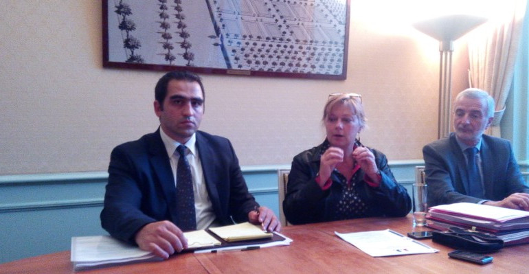 La préfète de la Sarthe Corrine Orzecohwski accompagnée de Philippe Gazagnes, directeur départemental de la cohésion sociale (à droite) et de Denis Saïm, chargé d'assurer le lien avec l'ensemble des élus (à gauche)