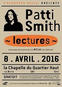 Le 8 avril 2016, à 19h, en partenariat avec la ville de Sète et les journées de l'amour, l'Echappée belle vous propose une rencontre avec Patti Smith.