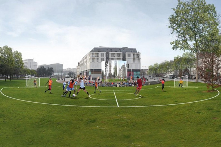 Un terrain de foot surprenant, en croissant de lune, avec sur le parvis, un miroir concave qui reflète le terrain et lui redonne ses proportions normales