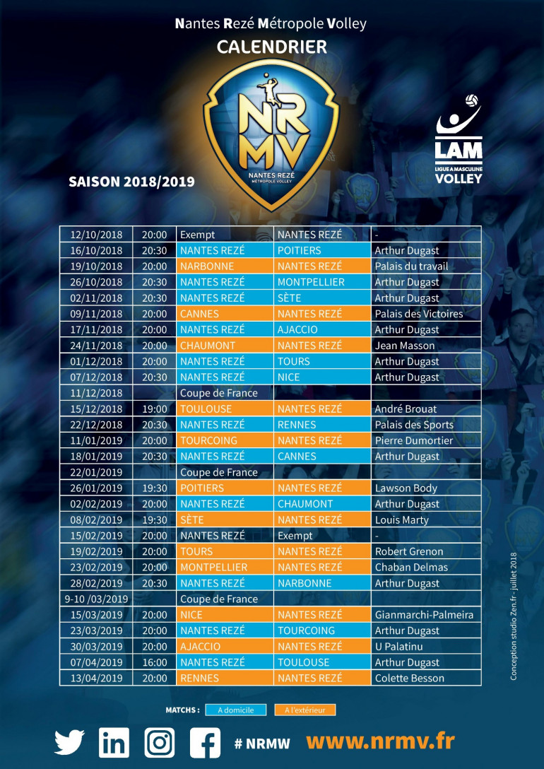 Voici le calendrier des matchs du Nantes Rezé Métropole Volley pour la Saison 2018/2019.