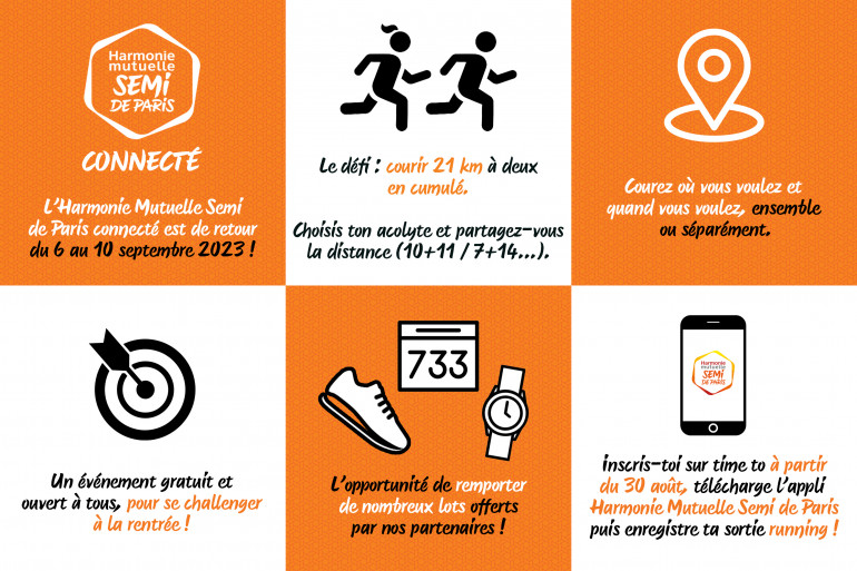 Qui dit retour de vacances et rentrée, dit nouveaux objectifs et bonnes résolutions ! Que ce soit pour se remettre à la course à pied ou simplement pour le plaisir de relever le défi, l’Harmonie Mutuelle Semi de Paris invite tous les coureurs à participer au Semi Connecté, du 6 au 10 septembre pour un challenge 100% gratuit. Une mise en jambe idéale pour l’Harmonie Mutuelle Semi de Paris qui se tiendra dimanche 3 mars 2024 dont les inscriptions ouvrent lundi 11 septembre prochain.