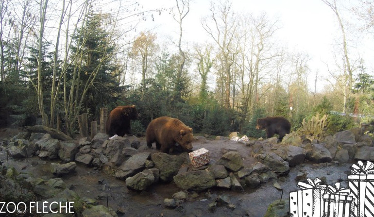 Plusieurs fois par semaine, Lions, Grizzlis et autres Chimpanzés reçoivent des cadeaux de la part des soigneurs (déguisés en petits lutins verts) sous forme "d'enrichissement". L'idée est de faire plaisir mais aussi d'observer le comportement face à la nouveauté. Des photos sont à retrouver sur le Facebook du Zoo de La Flèche. Une vidéo sera par ailleurs publiée la veille de Noël.