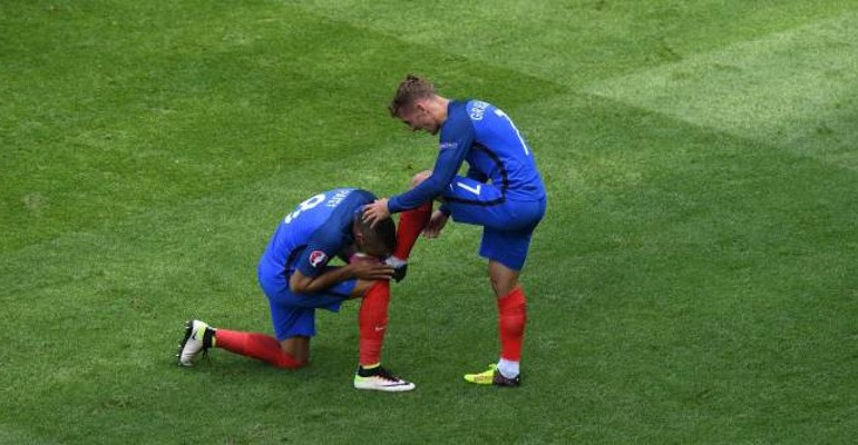 Dimitri Payet embrasse le pied d'Antoine Griezmann après son doublé