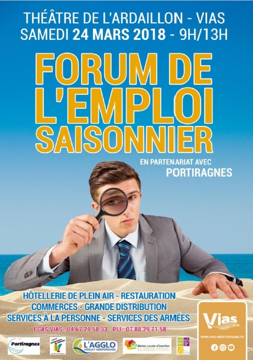 Vous recherchez un emploi pour la saison estivale dans le secteur de Vias, Portiragnes, la commune de Vias, en partenariat avec celle de Portiragnes, organise le Forum de l’emploi saisonnier annuel le samedi 24 mars prochain au Théâtre de l’Ardaillon. Vous pourrez directement rencontrer les employeurs recherchant du personnel pour la saison 2018, dans divers secteurs d’activités : hôtellerie de plein air, restauration, commerce, grande distribution, service des Armées, service à la personne, vente, accueil, animation… etc.Prenez vos CV et vos lettres de motivation !