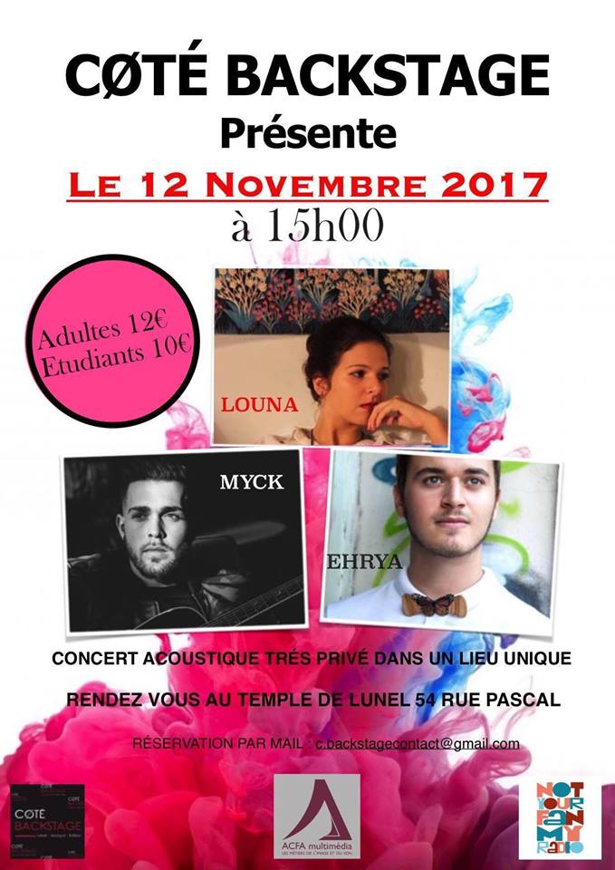 Le 12 novembre, Côté Backstage vous propose de découvrir ses artistes en live à Lunel avec sur scene Louna, Myck Officiel & EHRYA en concert acoustique