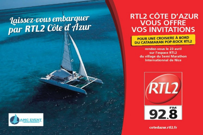 Pour gagner vos invitations : Rendez-vous au stand RTL2 les 23 et 24 Avril sur le village du Semi-Marathon à Nice, Remplissez vos bulletins de participation et montez peut être à bord du Catamaran Pop Rock by RTL2 Côte d'Azur, Samedi 14 Mai !