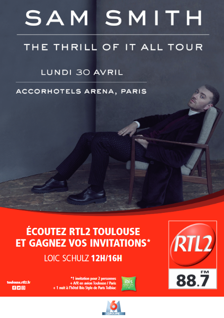 RTL2 Toulouse et l’hôtel Ibis Styles Paris Tolbiac Bibliothèque vous invitent au concert de Sam Smith le Lundi 30 Avril à 20h à l'AccorHôtels Arena ! Cette semaine, écoutez Loic Schulz entre 12h et 16h sur RTL2, dès que vous repérez la star de l'heure appelez le 05 61 63 23 23 et gagnez le transport depuis Toulouse, vos PASS pour le concert de Sam Smith à Paris et votre nuit dans l’hôtel Ibis Styles Paris Tolbiac Bibliothèque de France .Les plus beaux concerts partout en France avec hôtels ibis et RTL2 Toulouse le son pop rock !
