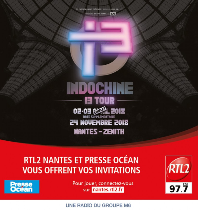 Cette semaine, RTL2 Nantes et Presse Océan vous offrent des invitations pour les concerts d'Indochine les 2 et 3 avril au Zénith de Nantes. Pour jouer, remplissez le bulletin que vous trouverez dans votre quotidien Presse Océan ou jouez dès maintenant sur le site de Presse Océan.