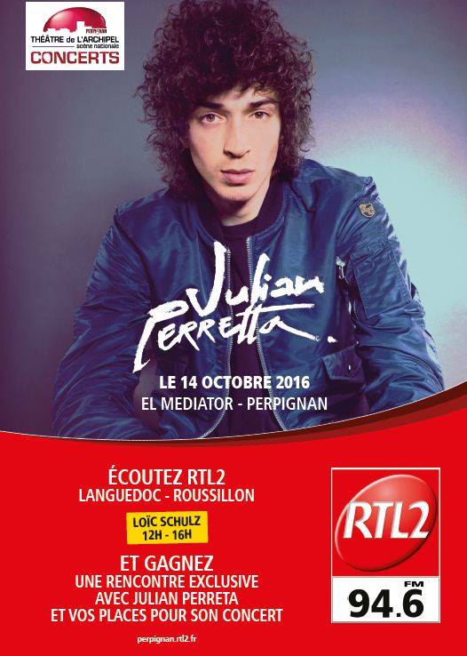 RTL2 Languedoc Roussillon vous offre les plus beaux événements dans les P.O et l'Aude ! Cette semaine écoutez Loic Schulz entre 12h et 16h sur RTL2, repérez la star de l'heure, appelez le 04 68 54 50 24 et gagnez votre rencontre exclusive en toute intimité avec Julian Perretta et vos places pour son concert le Vendredi 14 Octobre salle El Médiator à Perpignan ! RTL2 Languedoc Roussillon le son pop rock!