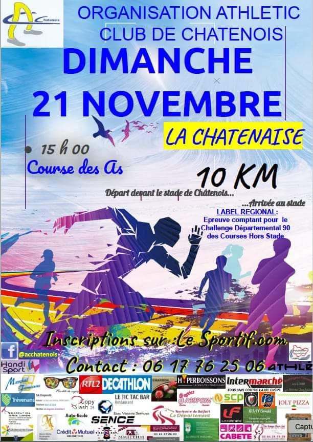 La Châtenaise a été conçue pour être ouvert et accessible à toutes et à tous, sans difficulté, son parcours le long de la coulée verte et son arrivée sur le stade de l'A.C. Chatenois en font une course agréable et conviviale. Que vous soyez à la pointe de l'entrainement ou si la course à pied est un moyen de s'évader, venez relever le défi du 10 kms.