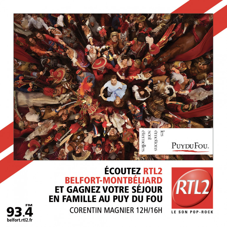 Écoutez Corentin Magnier entre 12h et 16h sur RTL2 Belfort Montbéliard, dès que vous entendez le signal RTL2, appelez le 03 63 19 30 01 et tentez de gagner votre journée pour 4 personnes au Puy du Fou, ainsi que vos entrées et des coupons restauration