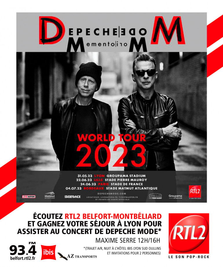 Pour gagner vos invitations + le transport aller-retour avec AZ Transports + l'hébergement avec Ibis Lyon Sud Oullins, écoutez RTL2 Belfort Montbéliard entre midi et 16h, dès que vous repérez le signal RTL2, appelez le 03 63 19 30 01 et gagnez votre séjour à Lyon pour le concert de Depeche Mode le 31 Mai au Groupama Stadium