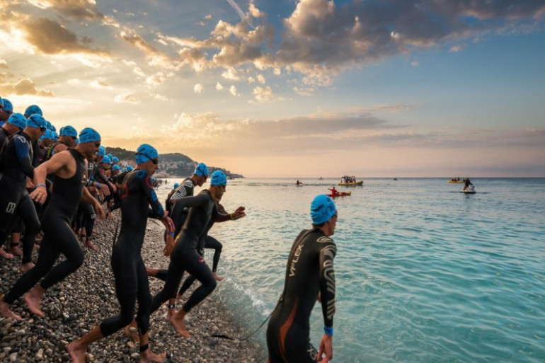 3.8 Km de natation dans la baie des anges, 180 Km de vélo dans l’arrière pays niçois et un marathon de 42 Km sur la promenade des anglais.