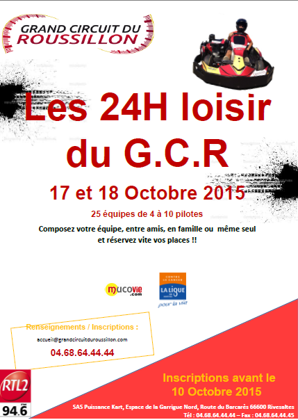 RTL2 Languedoc Roussillon partenaire des 24h loisirs de Karting du Grand Circuit du Roussillon ! Samedi 17 et dimanche 18 octobre à Rivesaltes – Venez participer ou applaudir le défi amateur de Karting du grand circuit du Roussillon , inscrivez votre équipe ou intégrez directement l'une des team présentes sur place et relevez le challenge 24h de karting !