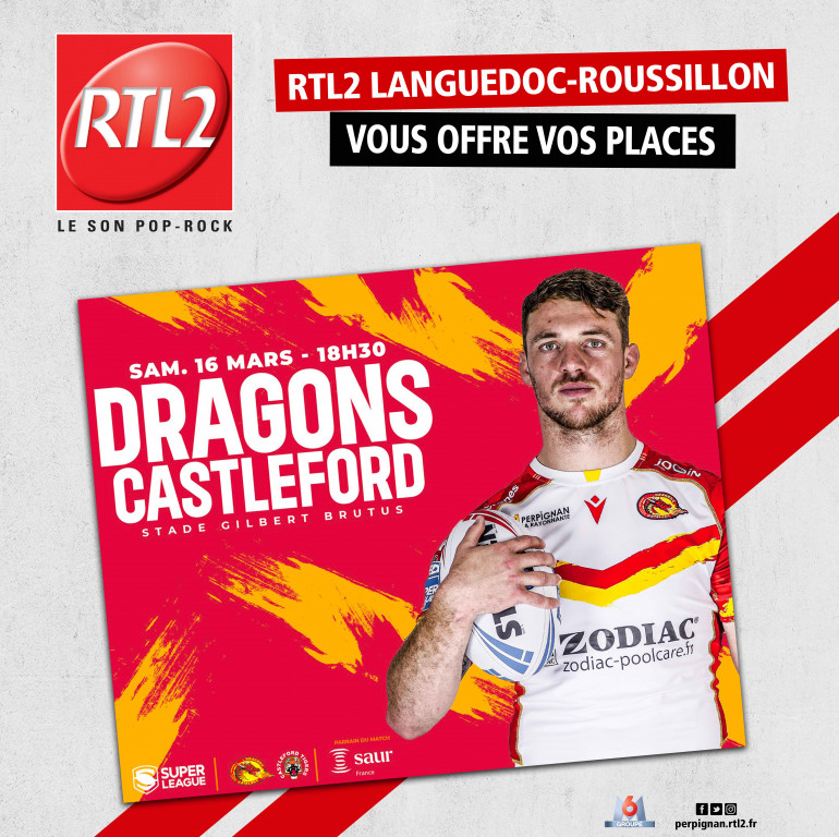 RTL2 Languedoc Roussillon vous offre vos places pour assister au match des Dragons Catalans contre Castleford, ce Samedi à 18h30 au stade Gilbert Brutus !