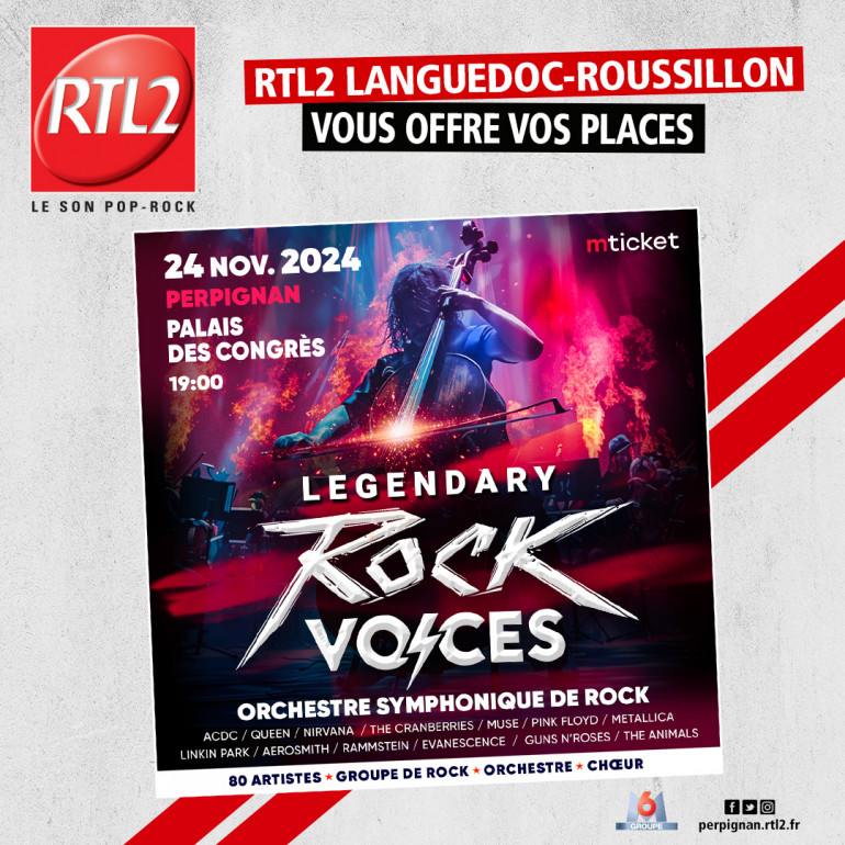 Cette semaine, écoutez RTL2 Languedoc-Roussillon entre midi et 16h, dès que vous entendez le signal RTL2, appelez le 04 30 32 36 01 et gagnez vos invitations pour Rock Symphony Voices, le 24 Novembre à 19h, au Palais des Congrès de Perpignan