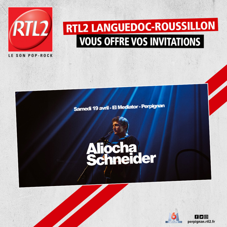 Pour jouer, écoutez RTL2 Languedoc-Roussillon entre midi et 16h, dès que vous repérez le signal RTL2, appelez le 04 30 32 36 01 et gagnez vos invitations pour le concert d'Aliocha Schneider, le 19 avril au Médiator