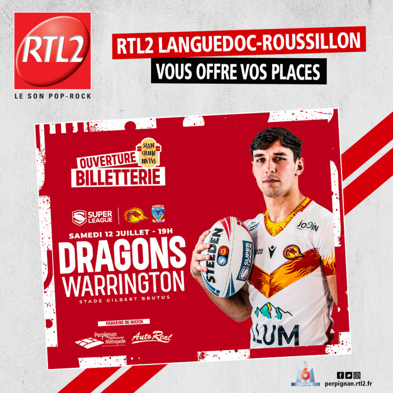 RTL2 Languedoc Roussillon vous offre vos places pour assister au match des Dragons Catalans contre Warrington, ce samedi à 19h au stade Gilbert Brutus !