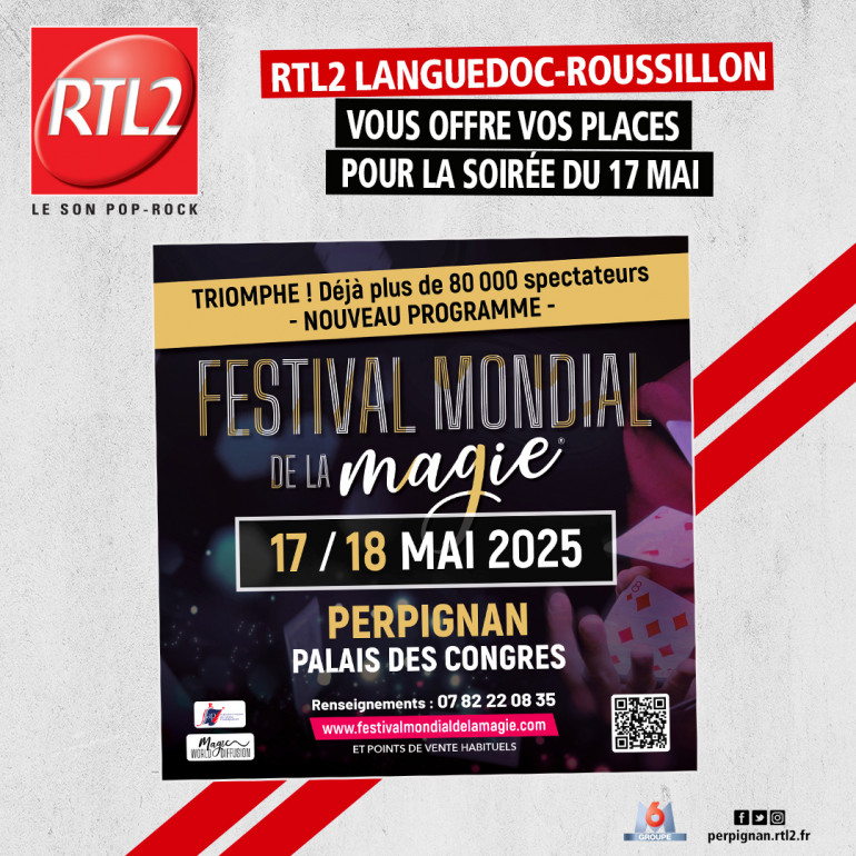 Cette semaine, écoutez RTL2 Languedoc-Roussillon entre midi et 16h, dès que vous repérez le signal RTL2, appelez le 04 30 32 36 01 et gagnez vos invitations pour le Festival mondial de la magie, le 17 mai au Palais des Congrès de Perpignan
