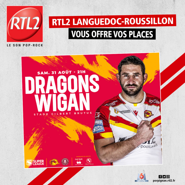 RTL2 Languedoc Roussillon vous offre vos places pour assister au match des Dragons Catalans contre Wigan, ce Samedi à 21h au stade Gilbert Brutus !