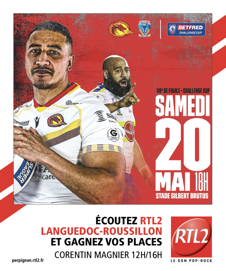 RTL2 Languedoc Roussillon partenaire des Dragons Catalans, vous offre vos places pour assister au match des Dragons Catalans contre Warrington, ce Samedi à 18h au stade Gilbert Brutus pour les 8e de finale de la Challenge Cup