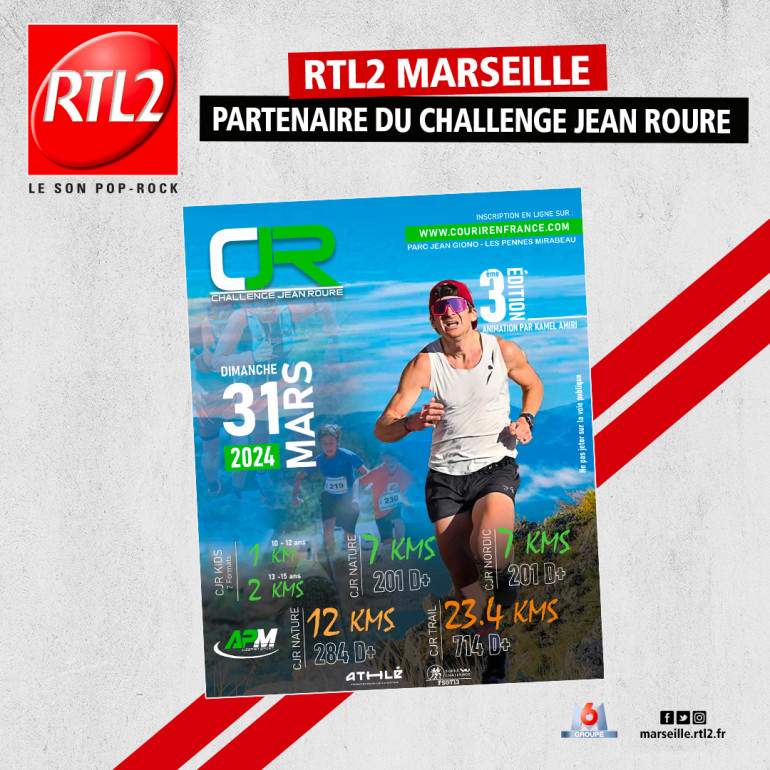 RTL2 Marseille présente la 3eme édition du Challenge Jean Roure 2024 ! Rendez-vous Dimanche 31 Mars, au parc Jean Giono aux Pennes Mirabeau. Apprécié par de nombreux traileurs de la région, venez participer aux différentes courses proposées, pour les minots âgés de 10-12 ans et de 13-15 ans la CGR KIDS.