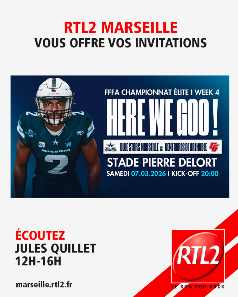 Pour supporter les Blue Stars Marseille contre les Centaures de Grenoble : Envoyez prénom, nom, téléphone, mail + ''BLUE'' sur marseille@rtl2.fr, bonne chance