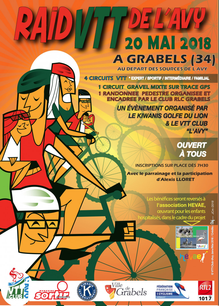 Le Raid VTT DE L’AVY est une randonnée VTT organisée par le KIWANIS ( Club de Golfe du Lion de Montpellier), qui intègrera cette année 4 parcours distincts, ouverts à tout public (de 13 à 59 km). Cette année, le club de randonnée pédestre de Grabels nous accompagne, avec une marche encadrée.