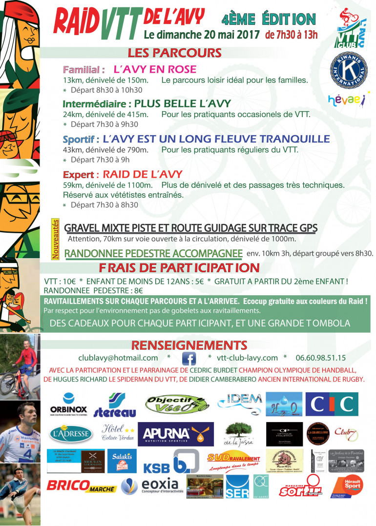 Le « RAID VTT DE L’AVY » est un évènement organisé au profit de l’association HEVAE, œuvrant pour le confort des enfants hospitalisés ( Site Hevae). Cette association est encadrée par des sportifs de haut niveau, présents le jour de la randonnée (Cédric BURDET, champion olympique de Hand-ball, Didier CAMBERABERO, international de Rugby,…), ainsi que par d’autres sportifs de renommée nationale ou locale, tels que Hugues RICHARD (le Spiderman du VTT), cette année Alexis LLORET (champion local), Victor KOREZKY,….. et bien d’autres,…