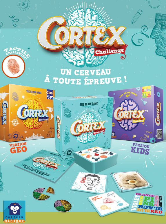 Challenge Cortex se décline en version "Géo" et "Kids", pour réunir toute la famille autour de jeux cérébraux, simples à jouer et excitants à partager. Chacune des boites de Cortes Challenge contient 90 cartes et 6 cerveaux-puzzles (24 pièces)
