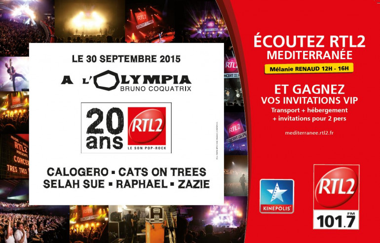 Cette semaine, écoutez RTL2 Méditerranée entre midi et 16h, repérez la star de l'apres midi, appelez le 04 67 59 21 21 et gagnez le transport, l’hôtel et vos invitations pour le Concert Très Très Privé RTL2 "Spécial 20 ans" le 30 septembre à l'Olympia.