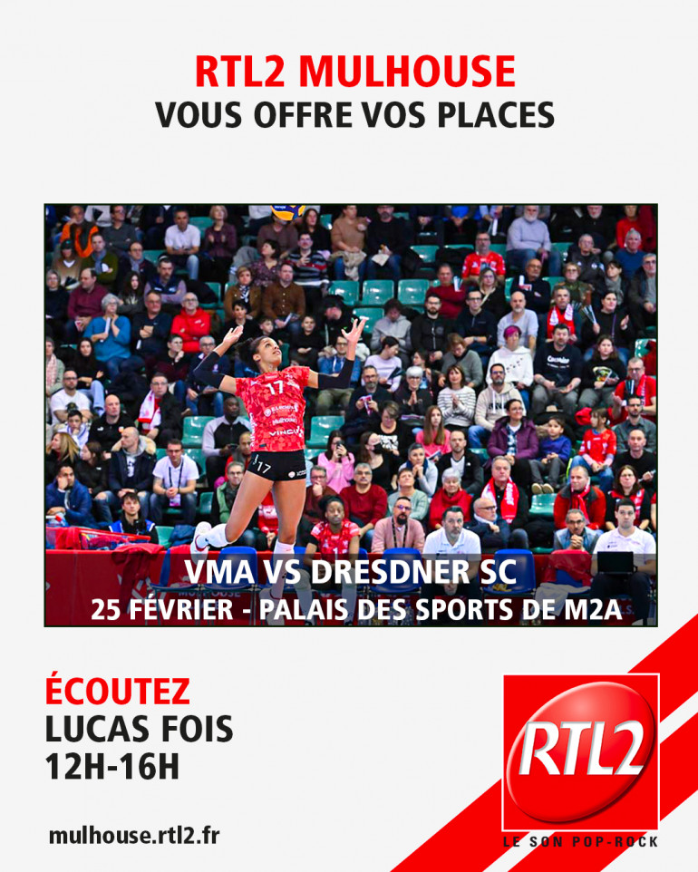 Le Volley Mulhouse Alsace est de retour ce mercredi au Palais des Sports de Mulhouse pour le match retour de s1/4 de final de CEV face à Dresdner SC . RTL2 Mulhouse, partenaire du Volley Mulhouse Alsace, vous invite au match le 25 février 2025 :
