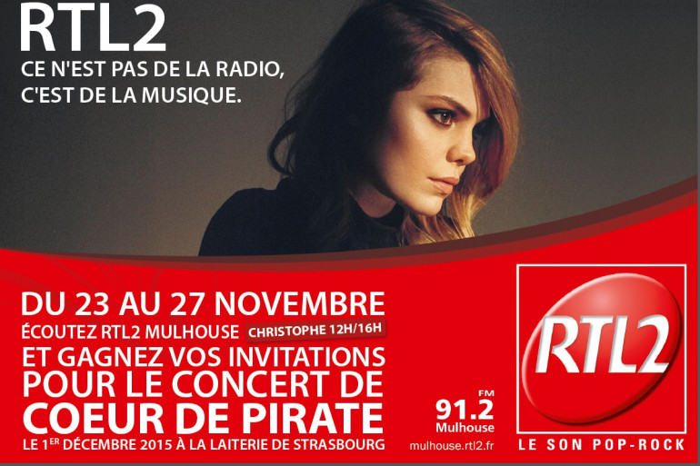 Jusque Vendredi 27 Novembre, écoutez Christophe Sandevoir sur RTL2 Mulhouse entre 12h00 et 16h00 et gagnez vos invitations en jouant avec la Star de l'Heure pour aller applaudir Coeur de Pirate Mardi 1er décembre à La Laiterie de Strasbourg.