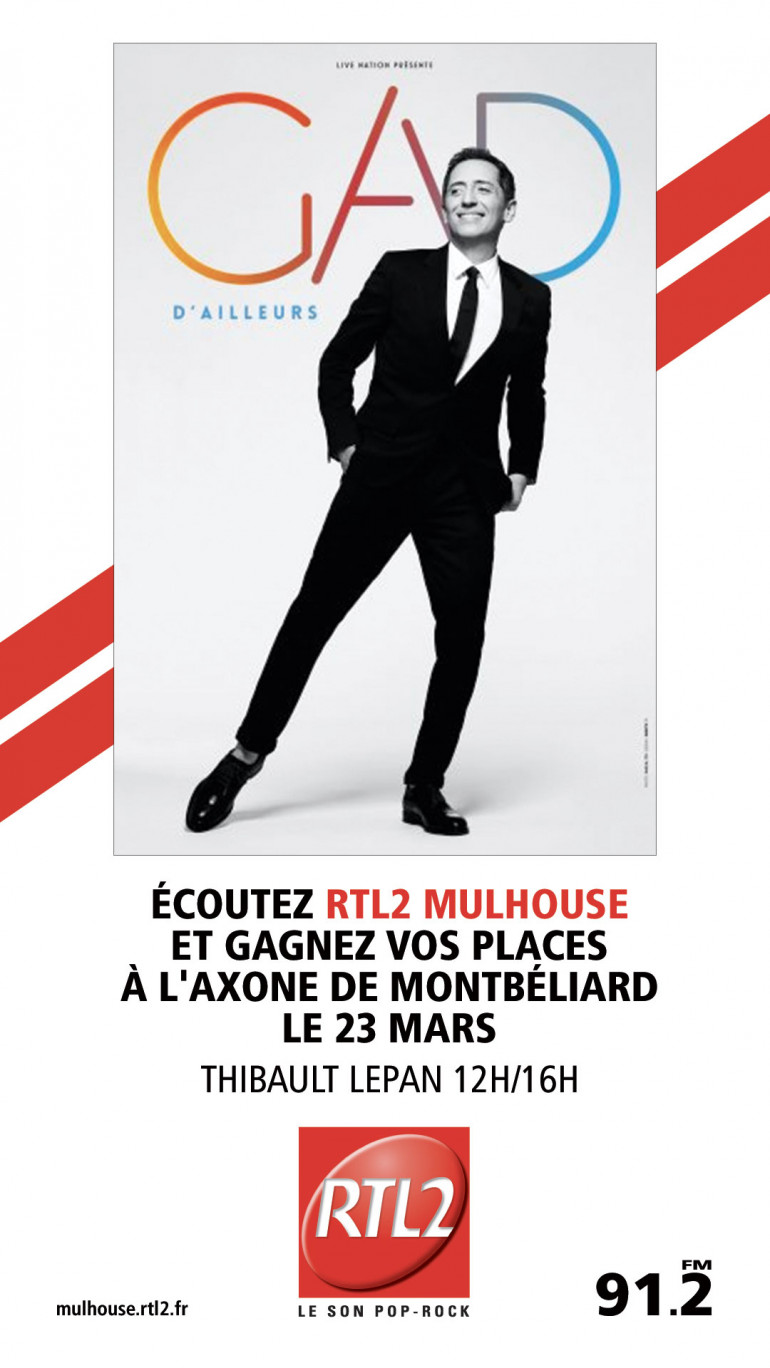 Pour jouer, écoutez Thibault Lepan entre 12h et 16h sur RTL2 Mulhouse, dès que vous repérez le SIGNAL RTL2 appelez au 03 68 32 36 61 et gagnez vos invitations pour applaudir Gad Elmaleh !