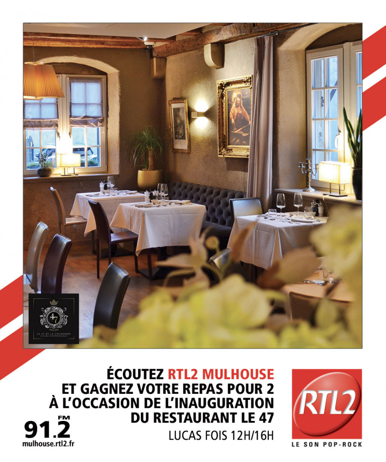 Cette semaine sur RTL2 Mulhouse, écoutez Lucas Fois de 12h à 16h, dès que vous entendez le signal RTL2, appelez au 03-68-32-36-61 et gagnez votre repas pour deux au 47, le nouveau restaurant d'Ensisheim by La Couronne.