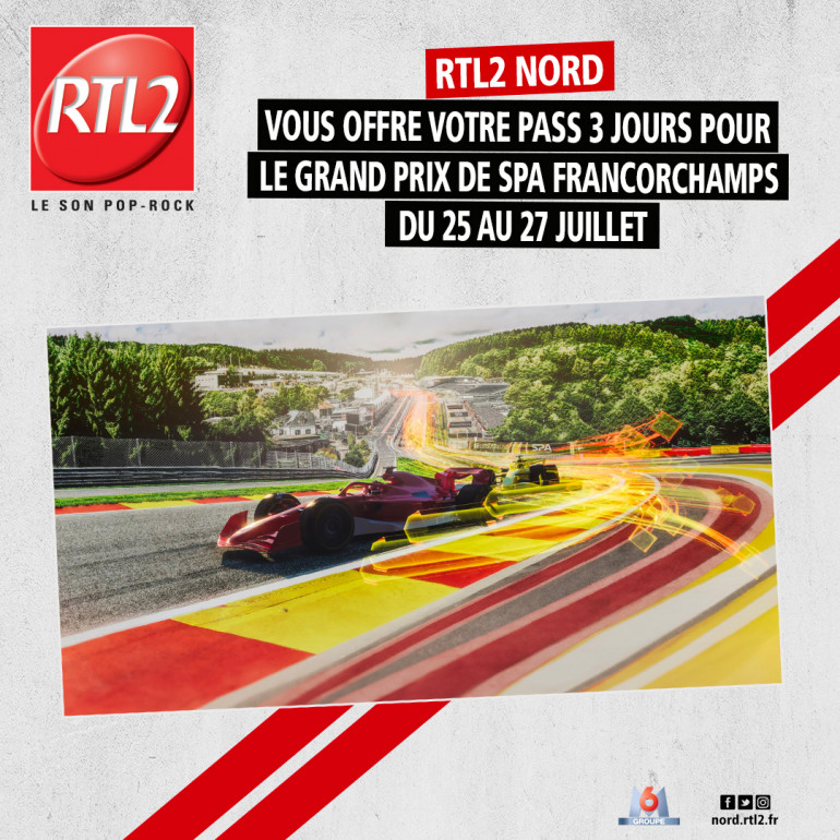 Cette semaine, écoutez RTL2 Nord entre 12h et 16h. Dès que vous repérez le SIGNAL RTL2, soyez les premiers à composer le 03 59 82 21 31, et tentez de gagner vos 2 Pass 3 jours pour le Grand Prix de Belgique de Formule 1, à Spa Francorchamps, les vendredi 25 - samedi 26 - dimanche 27 juillet !