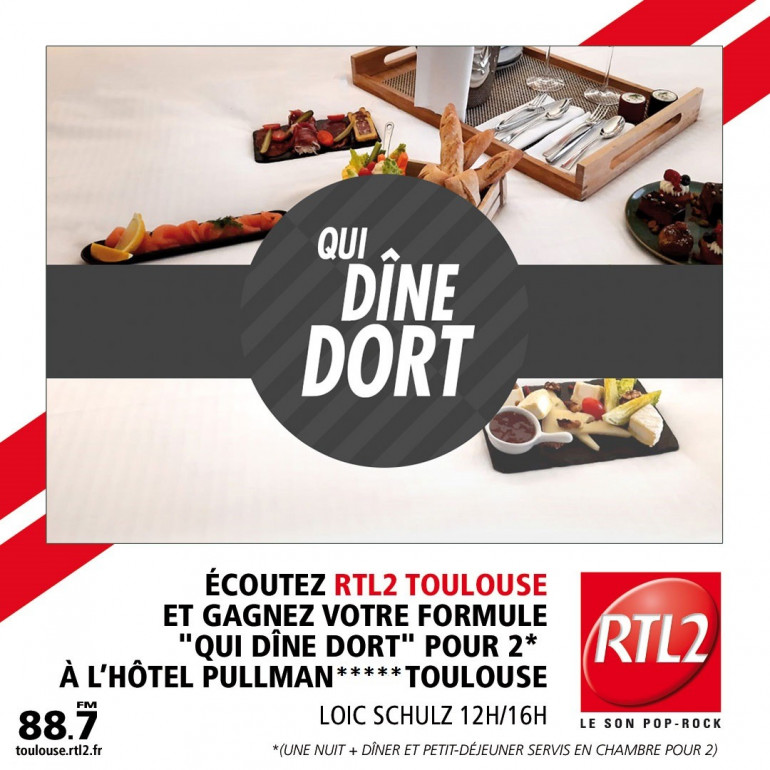 Dîner d’exception sur place servi en chambre puis nuit sublime dans l’hôtel et petit déjeuner ! Cette semaine, écoutez Loic Schulz entre 12h et 16h sur RTL2, dès que vous repérez le SIGNAL RTL2 appelez le 05 81 84 32 31 et tentez de gagner votre moment « QUI DINE DORT » à l’hôtel 5 étoiles PULLMAN TOULOUSE CENTRE RAMBLAS avec RTL2 !