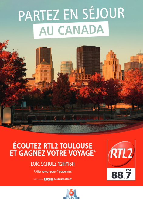 RTL2 Toulouse vous offre votre voyage au Canada ! Du Mardi 03 au Vendredi 13 Avril 2018, écoutez Loic Schulz entre 12h et 16h sur RTL2 dès que vous repérez la Star de l'Heure appelez le 05 61 63 23 23 et tentez de gagner vos 4 vols aller/retour au départ de Toulouse et à destination de Montréal !