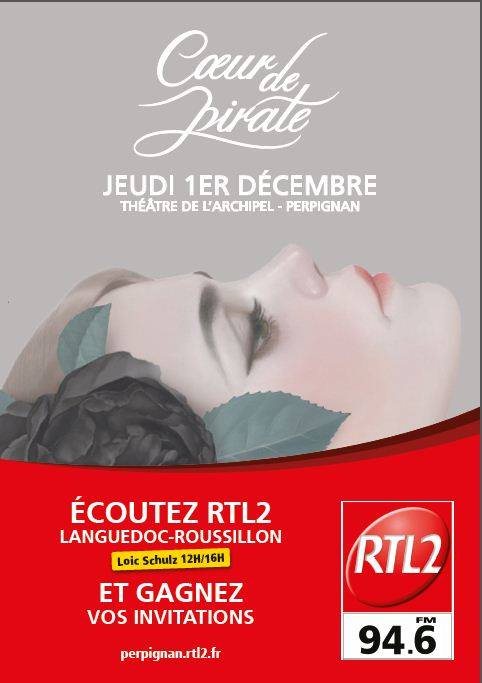 RTL2 Languedoc Roussillon vous offre les plus beaux concerts dans les Pyrénées Orientales et l'Aude ! Cette semaine écoutez Loic Schulz entre 12h et 16h sur RTL2, repérez la star de l'heure , appelez le 0468545024 et gagnez vos entrées pour le concert de Coeur de Pirate le Jeudi 1er Décembre Salle Grenat à Perpignan.