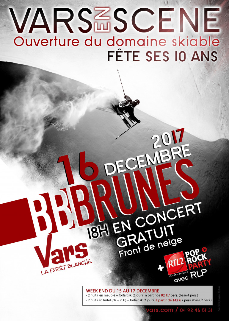 -dès 18h30 : assistez au concert de BB Brunes dans un cadre exceptionnel, au pied des pistes, et fêtez les 10 ans de "Vars en Scène" !