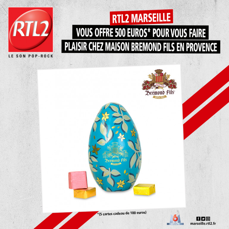 Cette semaine, tentez de gagner 100€ par jour, à dépenser dans les boutiques BREMOND FILS d'Aix et de Marseille, tentez votre chance en envoyant le mot de passe ''BREMOND'' et vos coordonnées (nom, prénom, ville, téléphone, mail) à marseille@rtl2.fr