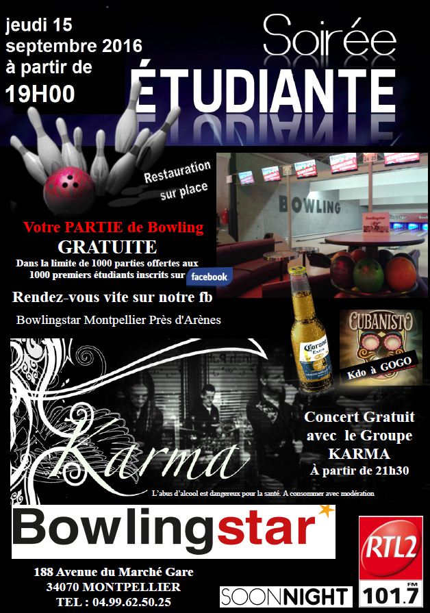 Rendez vous Jeudi 15 septembre pour la soirée étudiante au BowlingStar Près D'Arènes à Montpellier !