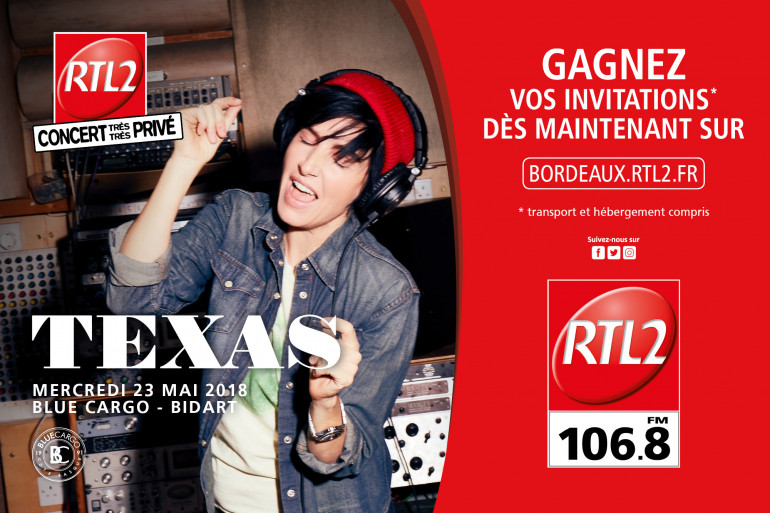RTL2 Bordeaux vous offre vos invitations, le transport et l'hébergement pour ce moment unique. Pour jouer, envoyez d'ores et déjà un mail à bordeaux@rtl2.fr, "TEXAS" dans l'objet du mail sans oublier votre prénom, votre nom et vos coordonnées complètes.