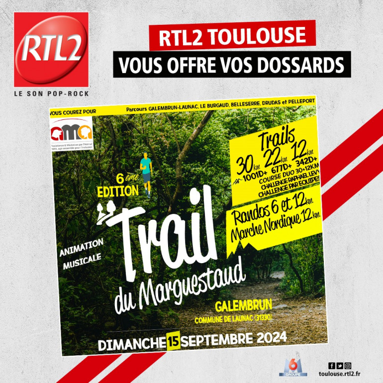Pour tenter de remporter vos dossards pour le Trail du Marguestaud, envoyez nous un mail à toulouse@rtl2.fr avec en OBJET : TRAIL suivi de vos noms, prénoms, adresse et numéro de téléphone.